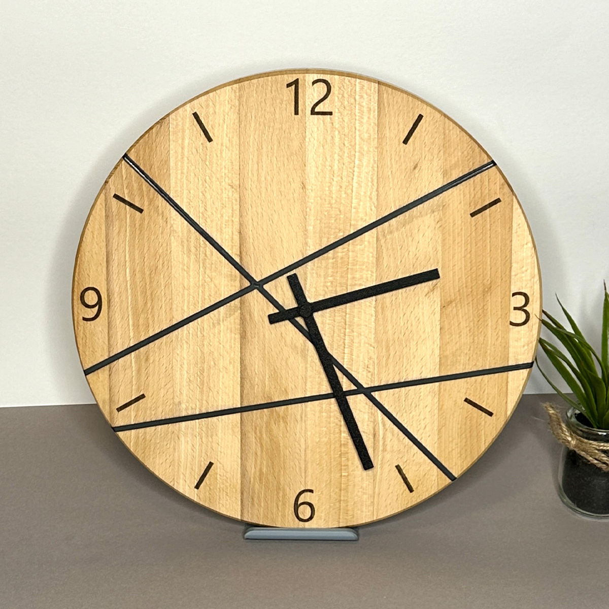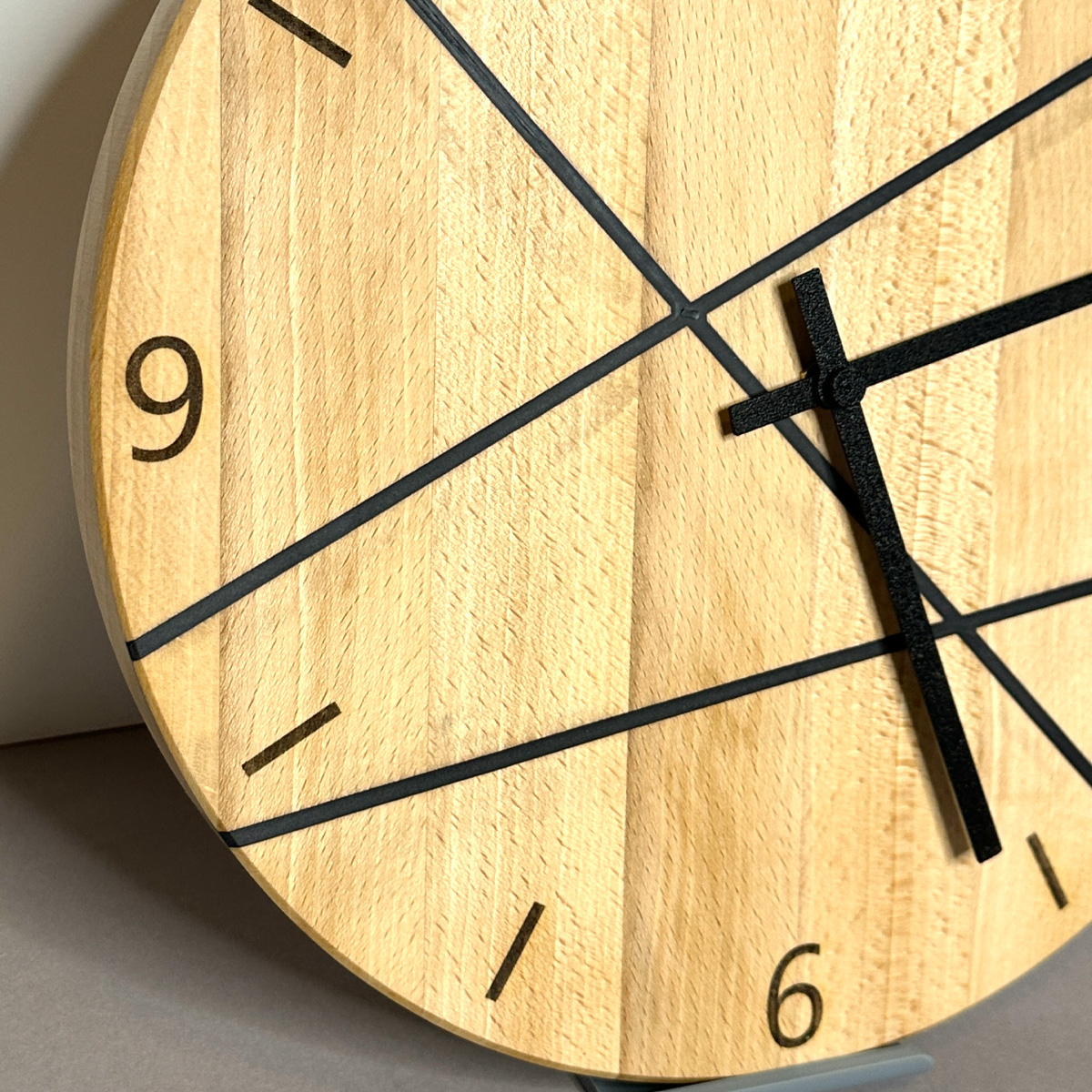 Die Kombination aus natürlichem Holz und eleganten schwarzen Zeigern schafft ein schönes modernes Design.
